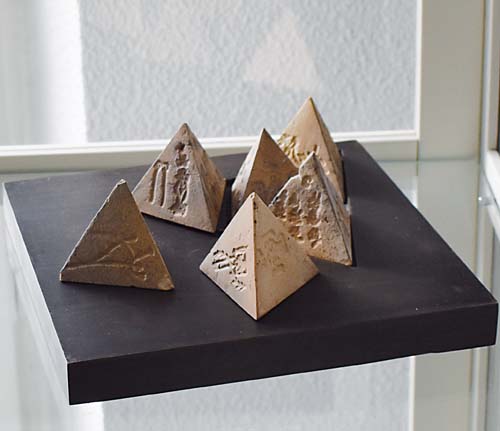 Sechs Keramik-Pyramiden mit antiken Schriftzeichen