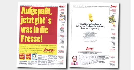 Kunde JUNG Bonbonfabrik Aufgaben Einzelaufgaben Logo – Nein Internet – NEIN PR – SPORADISCH Hier: Anzeigen- Kampagne in Fachpresse Weiter Zurück Gesamtübersicht