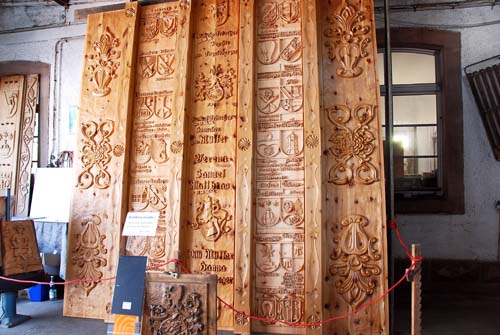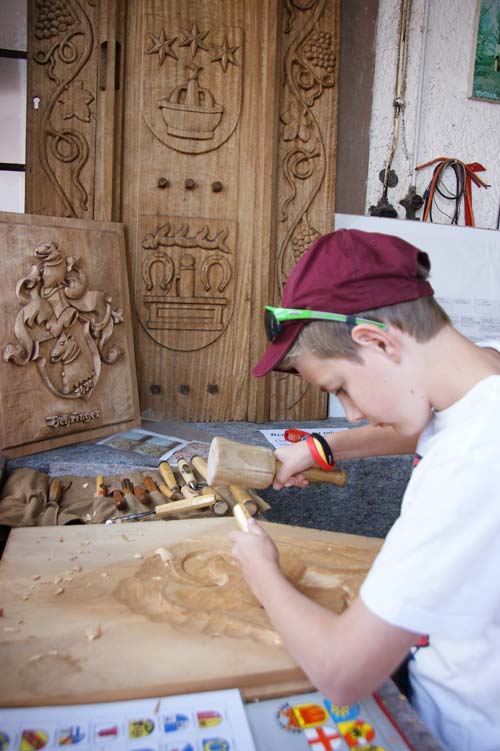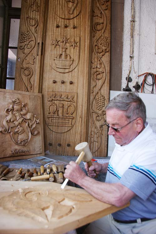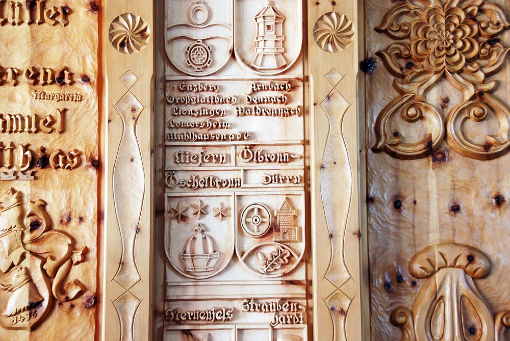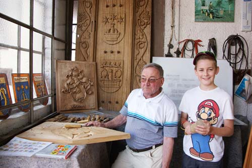 mit Enkel Lukas bei der Arbeit an seiner monumentalen Zimmerdecke mit Motiven aller Enzkreisgemeinden und seinem Familienwappen.