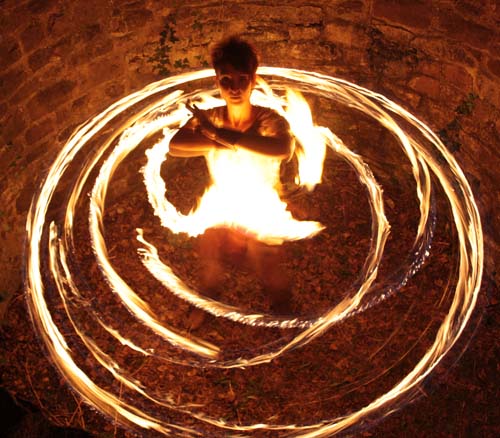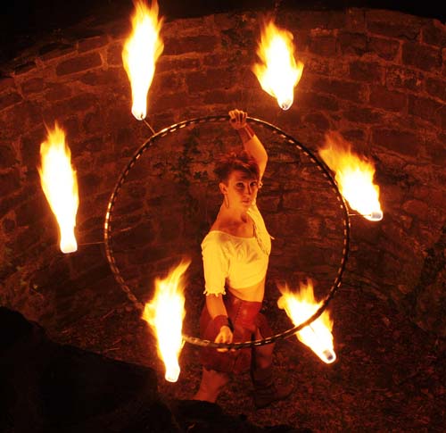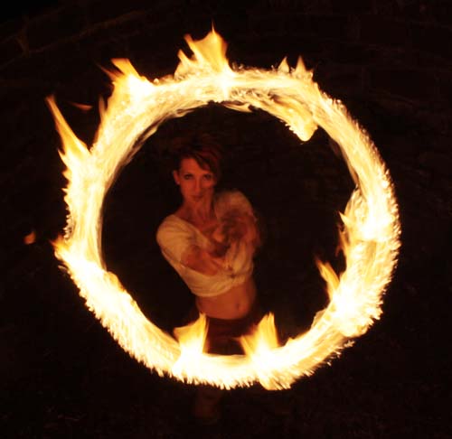 Jennifer »Mystique« Ochs begeistert alle mit ihrem waghalsigen Spiel mit dem Feuer. Trotz »Schafskälte« wollten Dutzende von Zuschauern am Samstagnacht ihre Feuerakrobatik sehen und wärmten sich wenigstens an den schönen Bildern die »Mystique« in die Nacht vor der Schmiede zauberte.