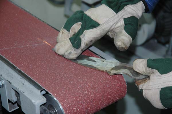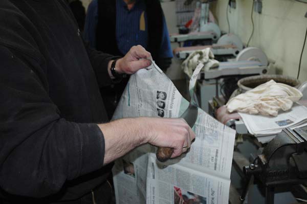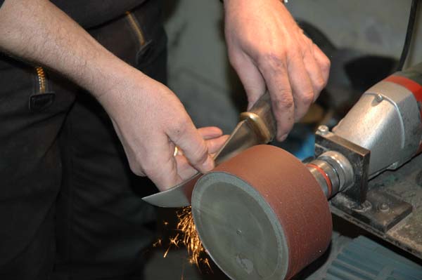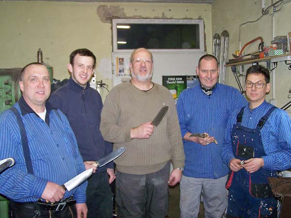 Auf einer Kartonschablone zeichnen wir die Form unseres Messers auf Schlag für Schlag wid die grobe Form geschmiedet … … und dazwischen muss der Stahl natürlich immer wieder glühen Die Schneide wird auf dem Bandschleifer angelegt Ohne die Hilfe von Wolfgang Macht wäre man allerdings verloren Auch das Bohren gehört zum Fertigungsprozess Genau so wie das Feilen Und manchmal geht's auch am Bandschleifer heiß her Joachim bastelt einen Messergriff Michael prüft die Präzision seines Rohlings Die Japansäge packt auch das mexikanische Tropenholz Und immer wieder geht es heiß her in der Werkstatt Oder es es müffelt ein wenig wenn der Stahl ein Ölbad nimmt Langsam sieht man was einmal werden soll Das kann sich doch sehen lassen!!! Eine verdammt scharfe Angelegenheit Wie man hier deutlich sehen kann Fünf scharfe Geräte … … und ihre stolzen Macher Noch einmal ein Fünferpack … … und deren Schmiede.