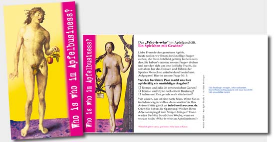 Kunde Media Access Aufgaben Einzelprojekte Logo – NEIN Internet – NEIN PR – Nein Hier: Direktwerbe- Kampagne Weiter Zurück Gesamtübersicht Übersicht Dienstleistung