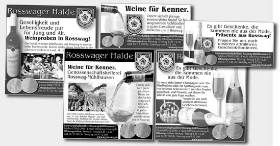 Kunde Genossenschafts- kellerei Rosswag-Mühlhausen Aufgaben Einzelprojekte Logo – NEIN CD – JA Internet – NEIN PR – NEIN Hier: Anzeigen in Tagespresse Weiter Zurück Gesamtübersicht Übersicht Dienstleistung