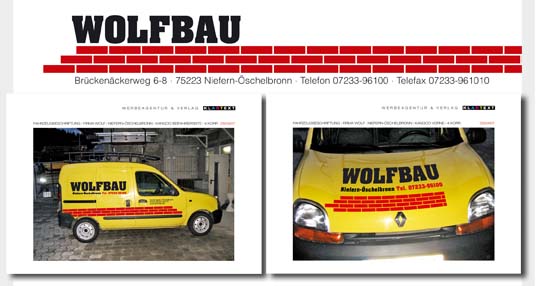 Kunde WOLFBAU Bauunternehmen Einzelaufgaben Logo – Ja (Modifikation) Internet – Nein PR – Nein Hier: CD für KFZ-Beschriftung Weiter Zurück Gesamtübersicht