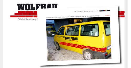 Kunde WOLFBAU Bauunternehmen Einzelaufgaben Logo – Ja (Modifikation) Internet – Nein PR – Nein Hier: CD für KFZ-Beschriftung Weiter Zurück Gesamtübersicht
